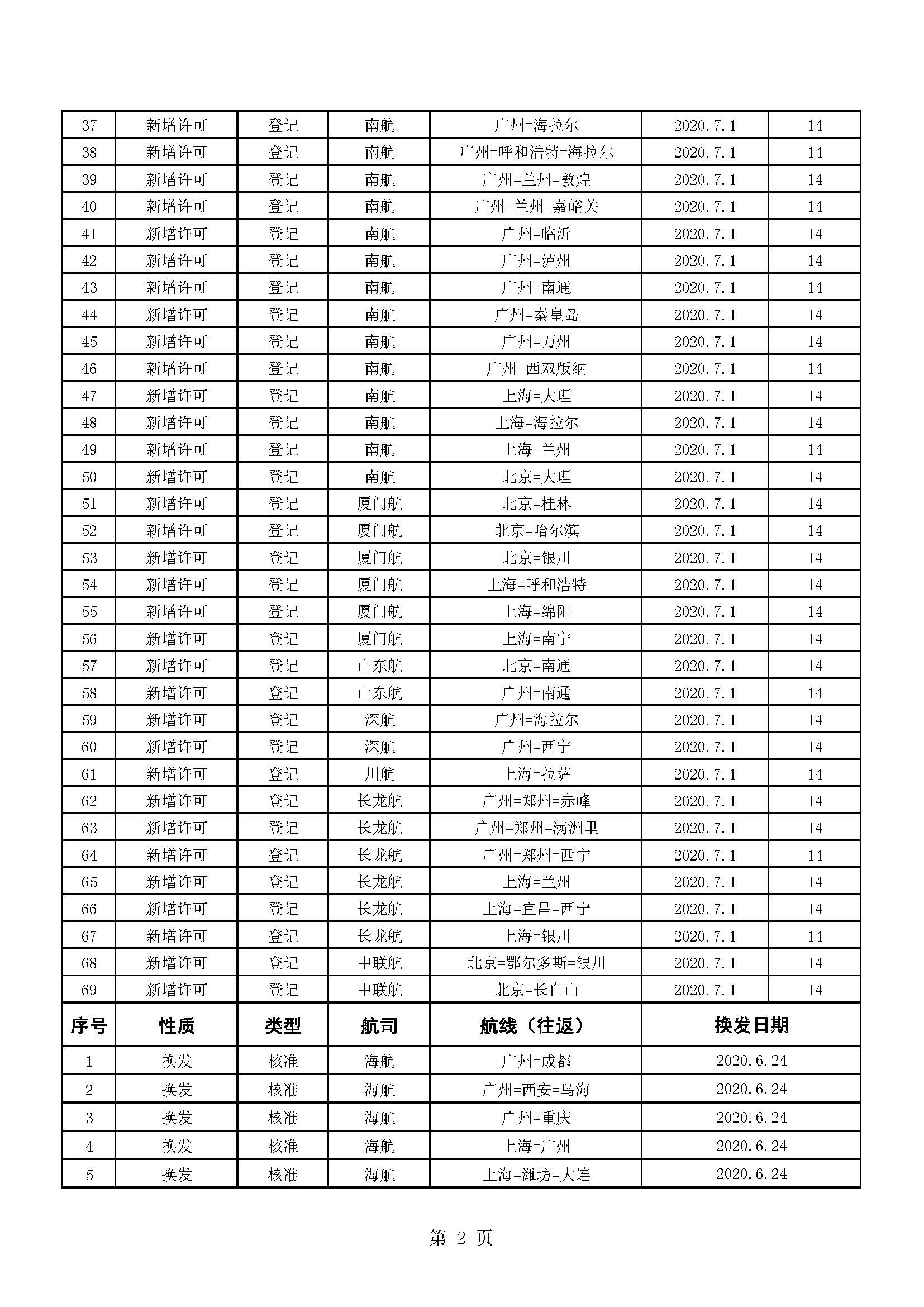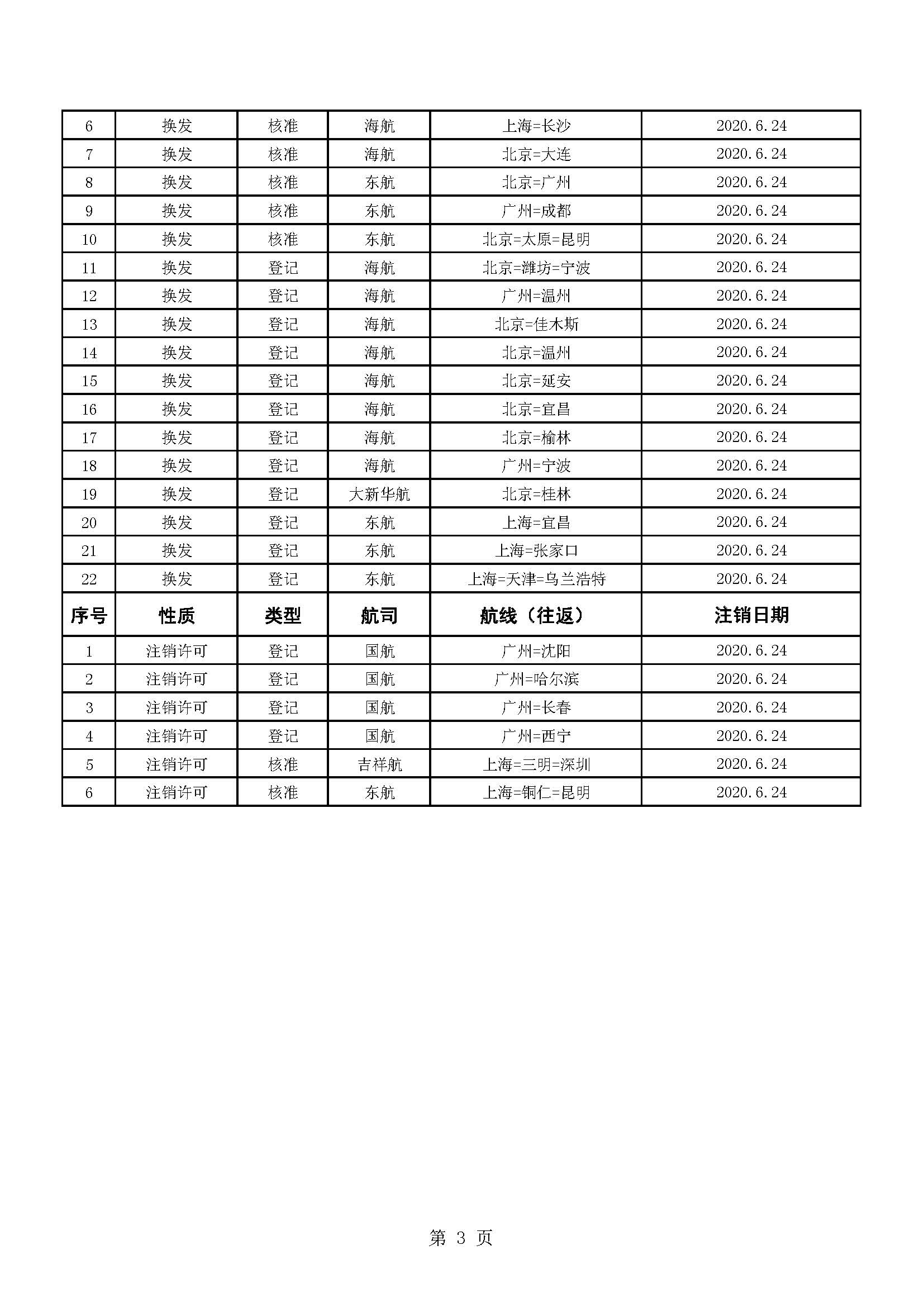 民航局2020年夏秋航季季中颁发、换发和注销国内航线经营许可信息通告